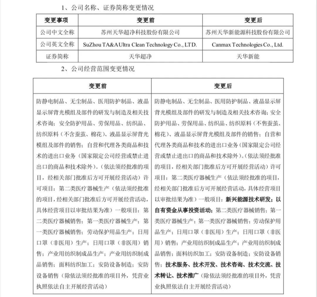 自2023年3月16日起,本公司名称已从“苏州天华超净科技股份有限公司”变更为“苏州天华新能源科技股份有限公司”,该名称变更已在主管市场监督管理局、银行等系统中完成登记。同时,公司英文全称、证券简称及经营范围变更,具体变更信息如下: