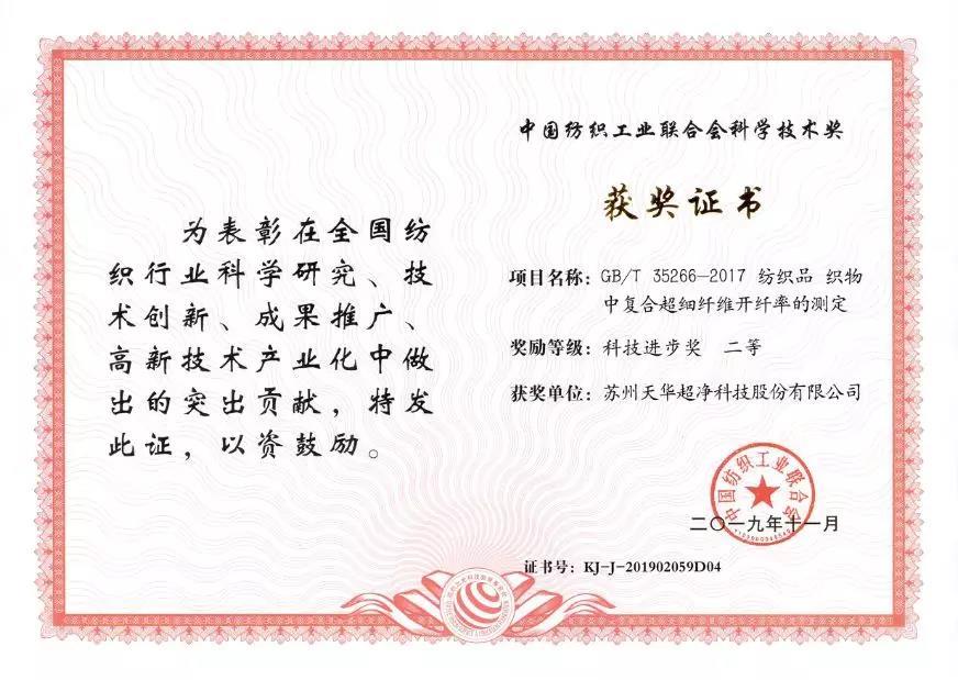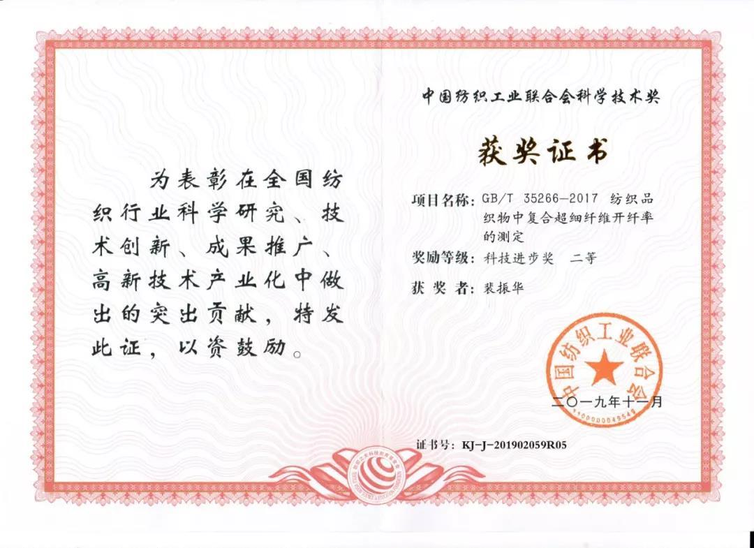会议公布了《关于2019年度中纺联科学技术奖授奖决定》,公司参与完成的“GB/T 35266 2017 纺织品 织物中复合超细纤维开纤率的测定”荣获“纺织之光”2019年度中国纺织工业联合会科技进步奖二等奖。