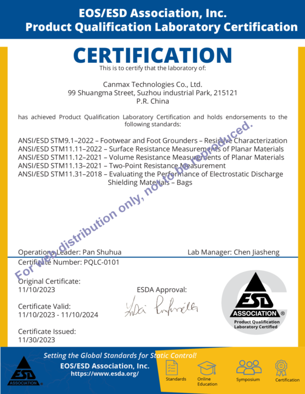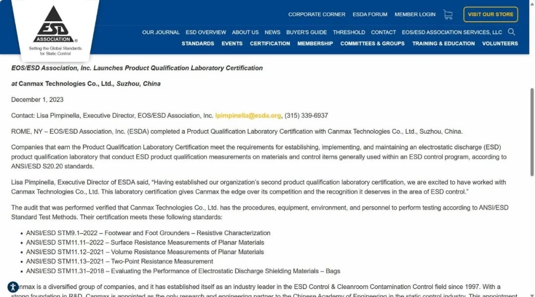ESDA执行董事Lisa Pimpinella表示:“感谢Canmax Technologies Co., Ltd. 参与开展这项新推出的实验室认证项目。这项认证不仅有利于增强天华的市场竞争优势,更是企业在ESD管控领域获得广泛认可的体现。”