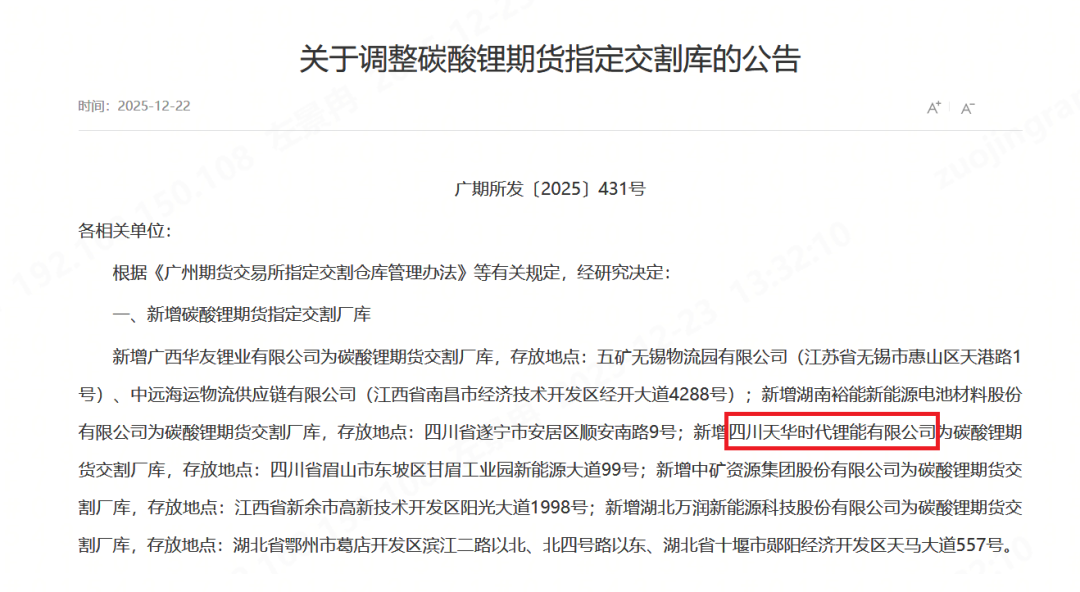 12月22日,广州期货交易所正式发布公告,新增天华新能子公司四川天华时代锂能有限公司为碳酸锂期货指定交割厂库,标准仓单最大量为900吨,日发货速度60吨/天,厂库地址位于四川省眉山市东坡区甘眉工业园新能源大道99号。